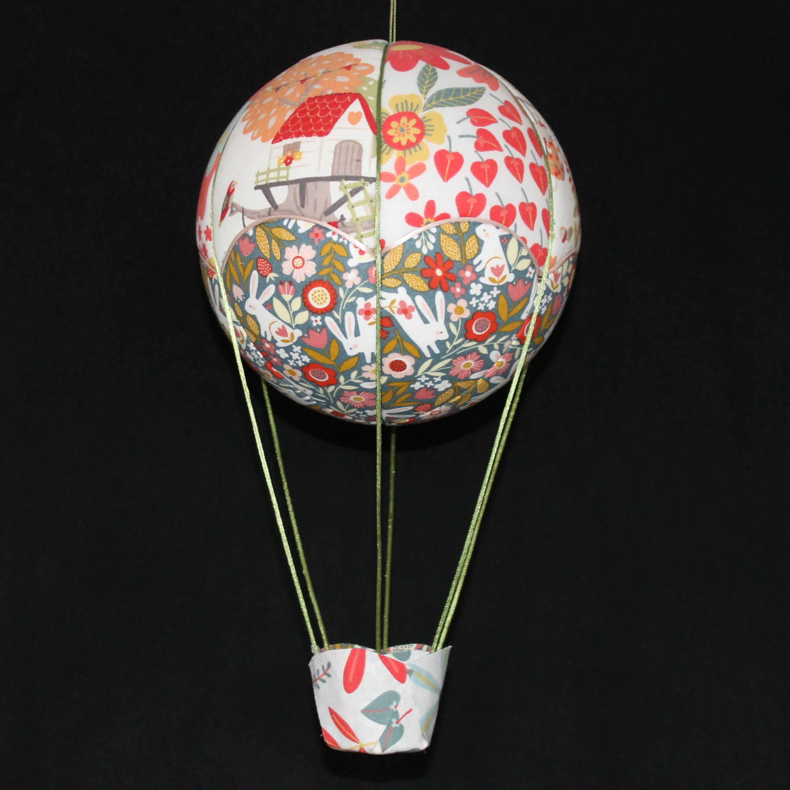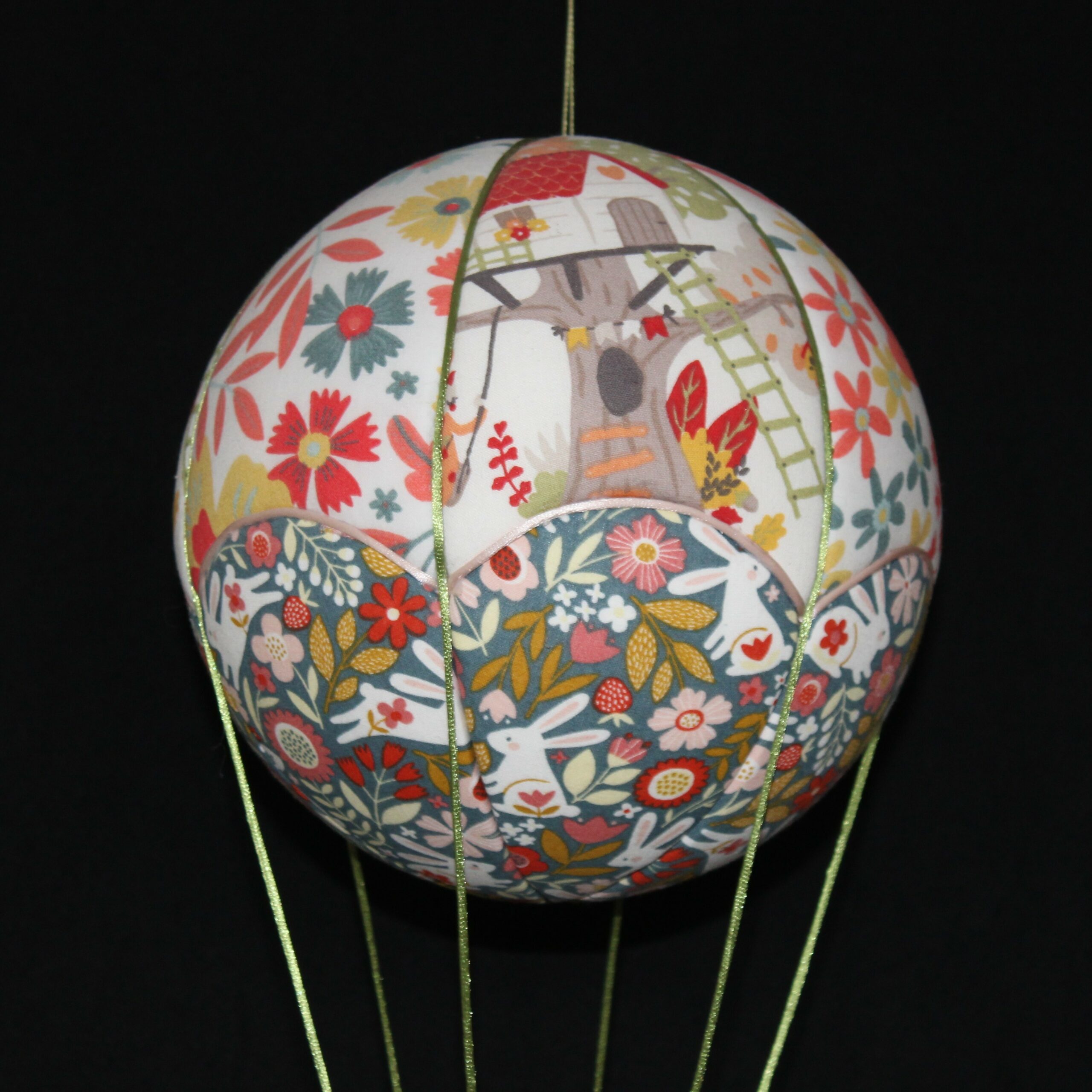 Montgolfière de décoration , en tissus imprimés Cabanes et jardin .