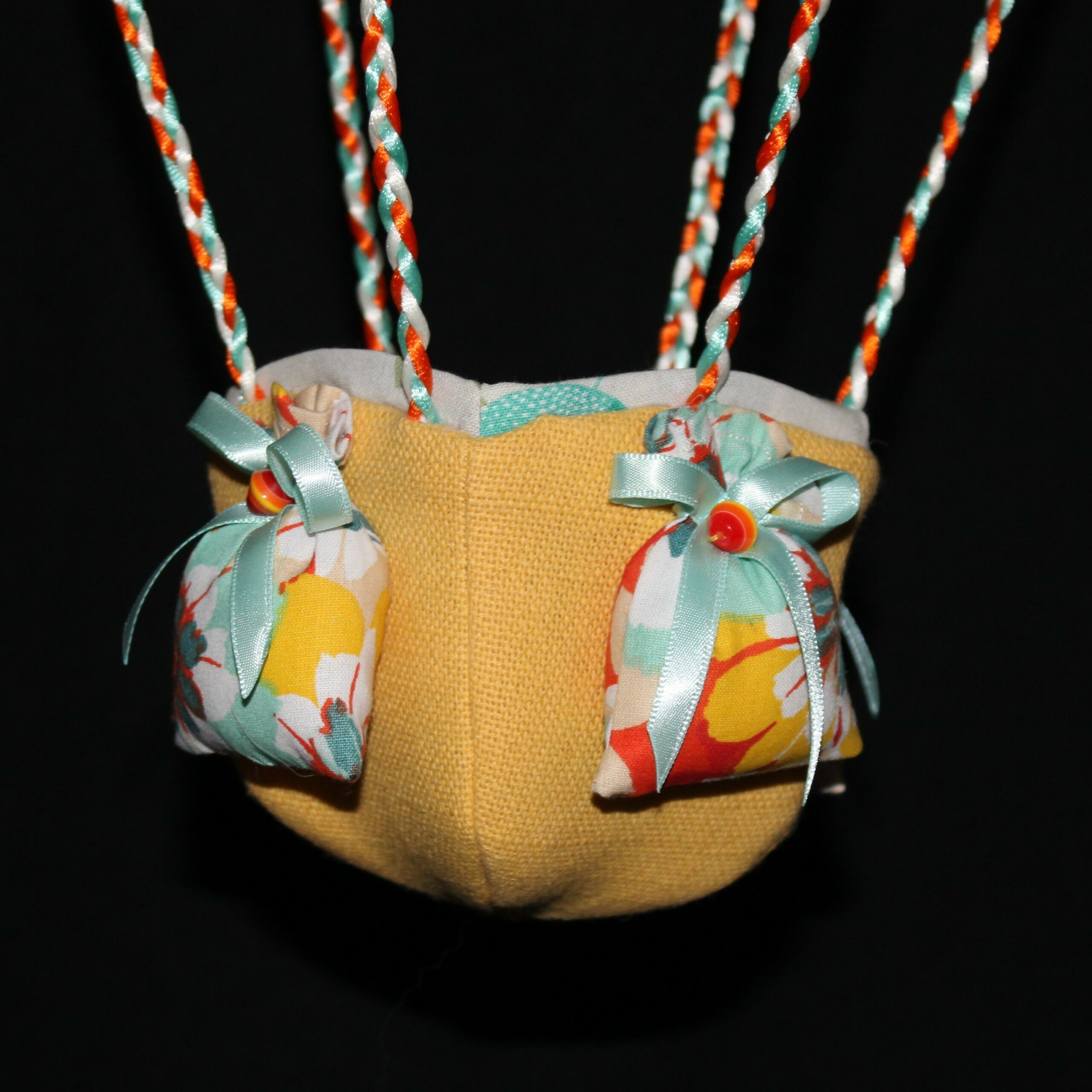 Travail d’incrustation de tissus sur une boule de polystyrène. Un panier entièrement cousu, doublé et muni de petits sacs « lest », complète l’ensemble.