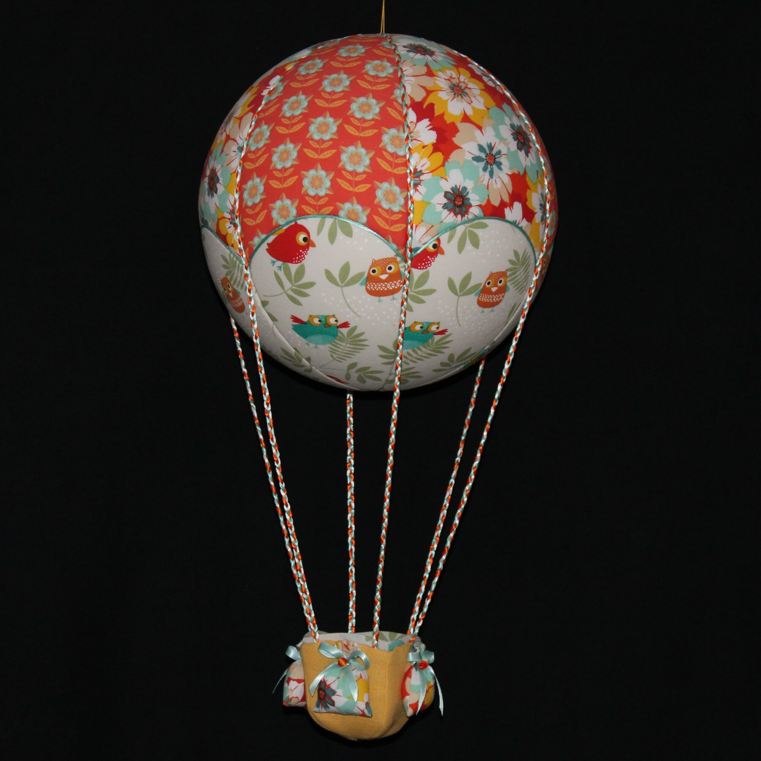 Montgolfière de décoration, en tissus imprimés chouettes et fleurs.