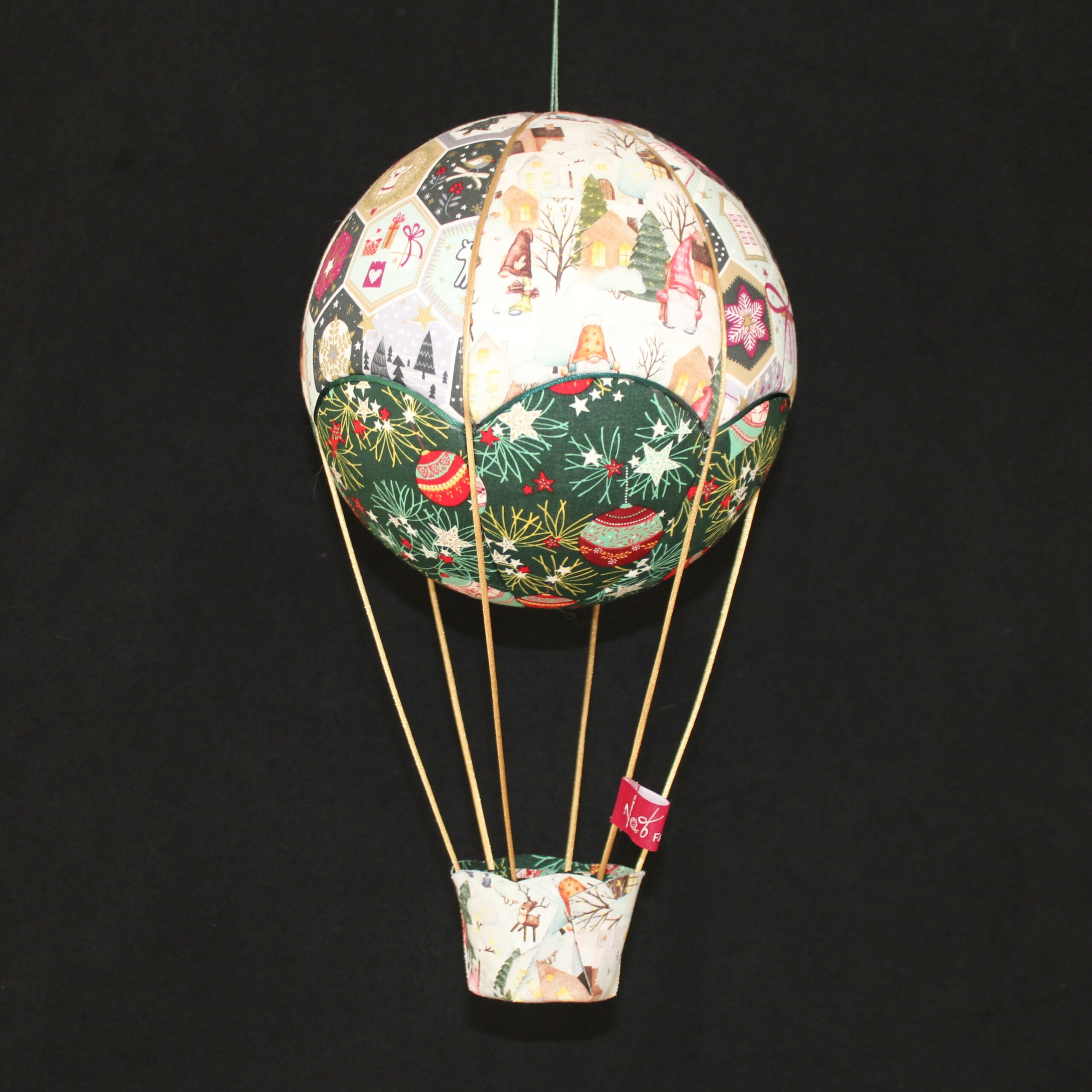 Montgolfière de décoration, en tissus imprimés sur le thème de Noël.