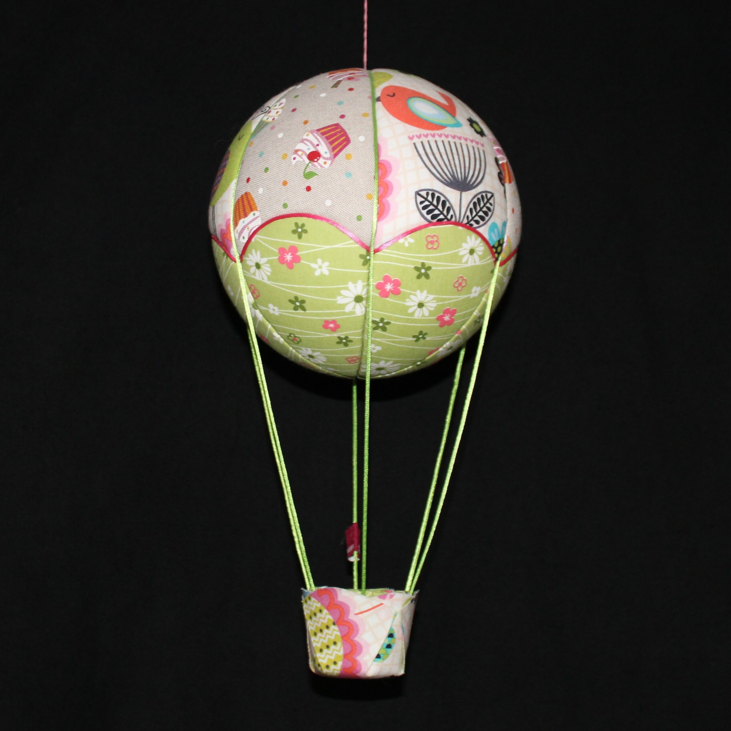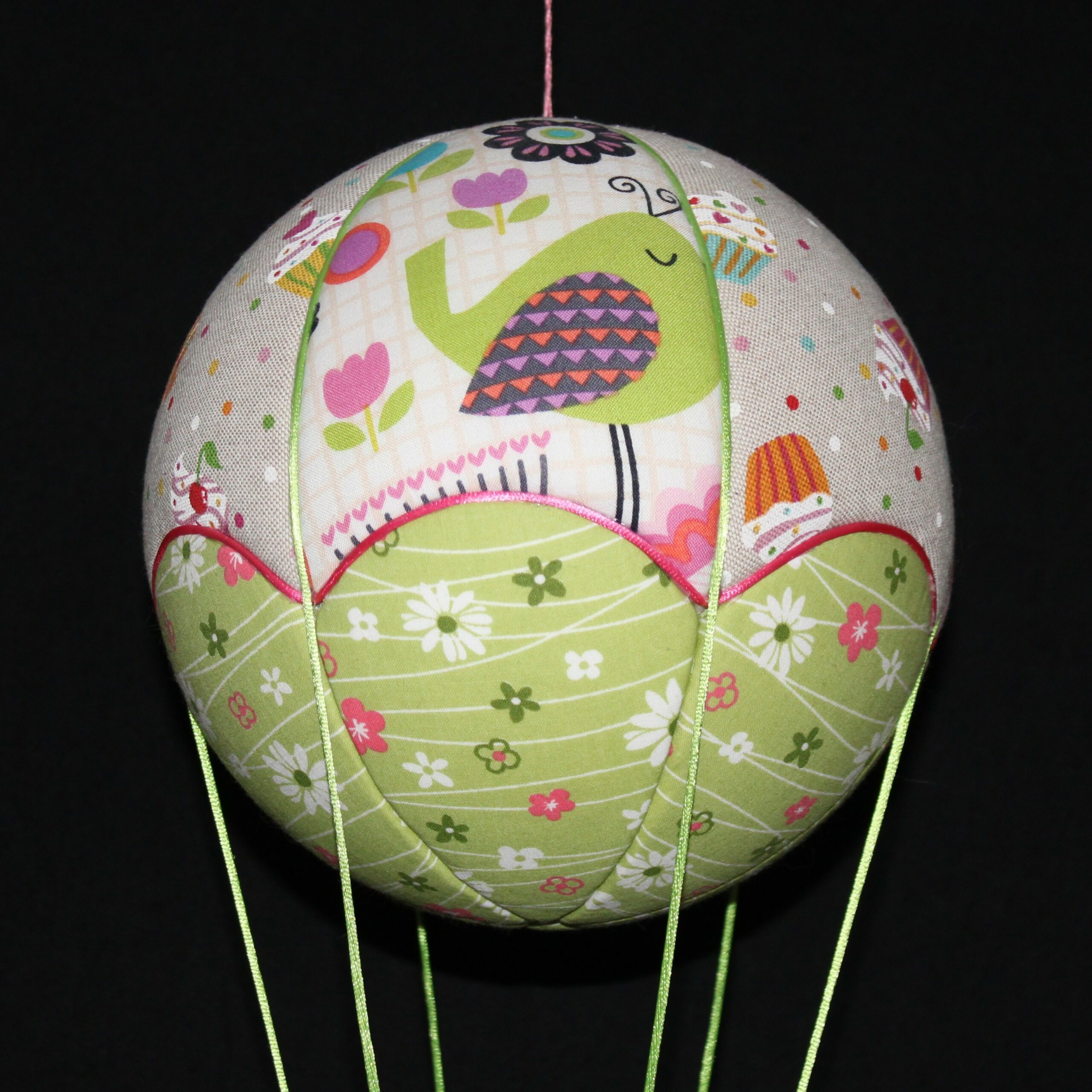Montgolfière de décoration , en tissus imprimés oiseaux et cupcakes.