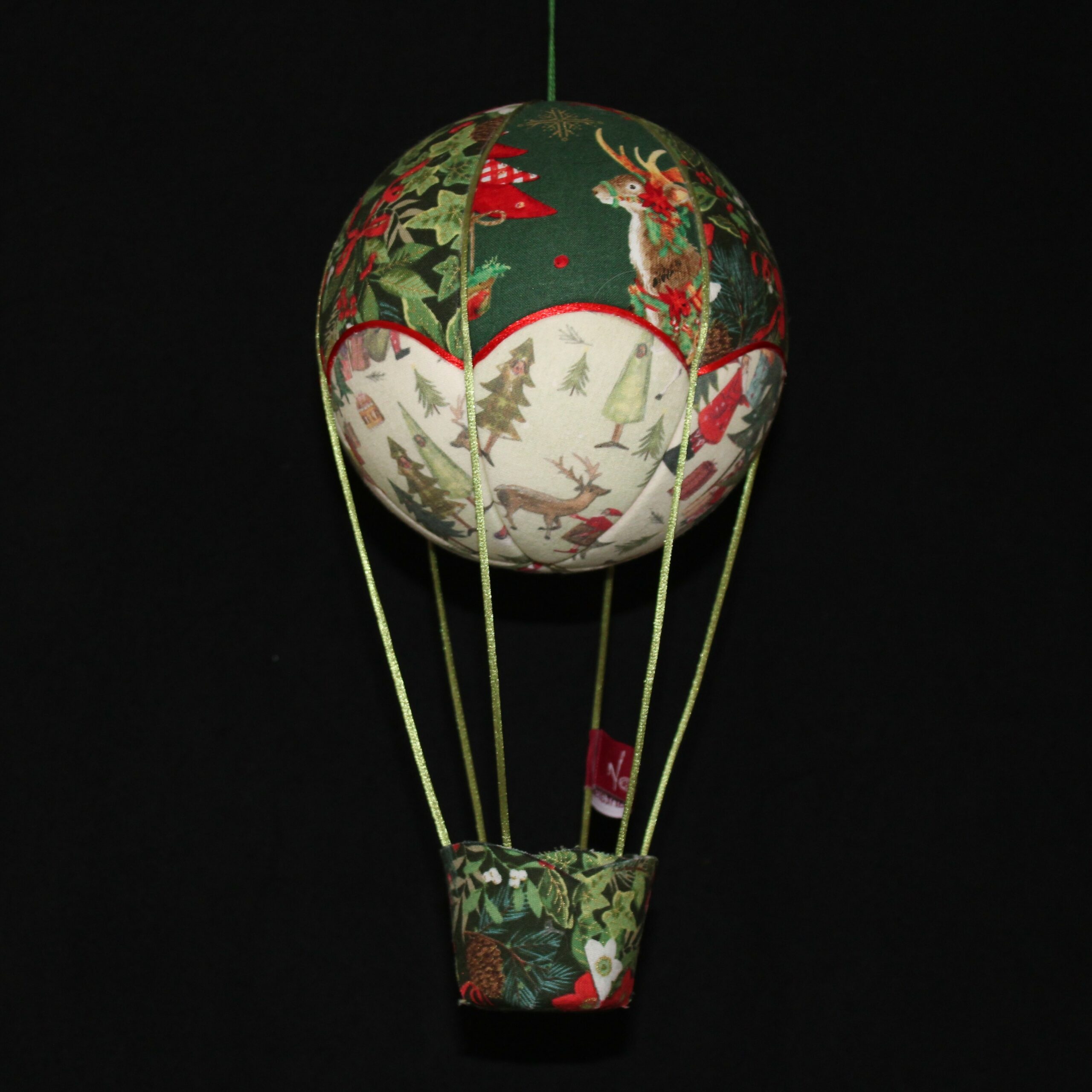 Montgolfière de décoration, en tissus imprimés sur le thème de Noël.